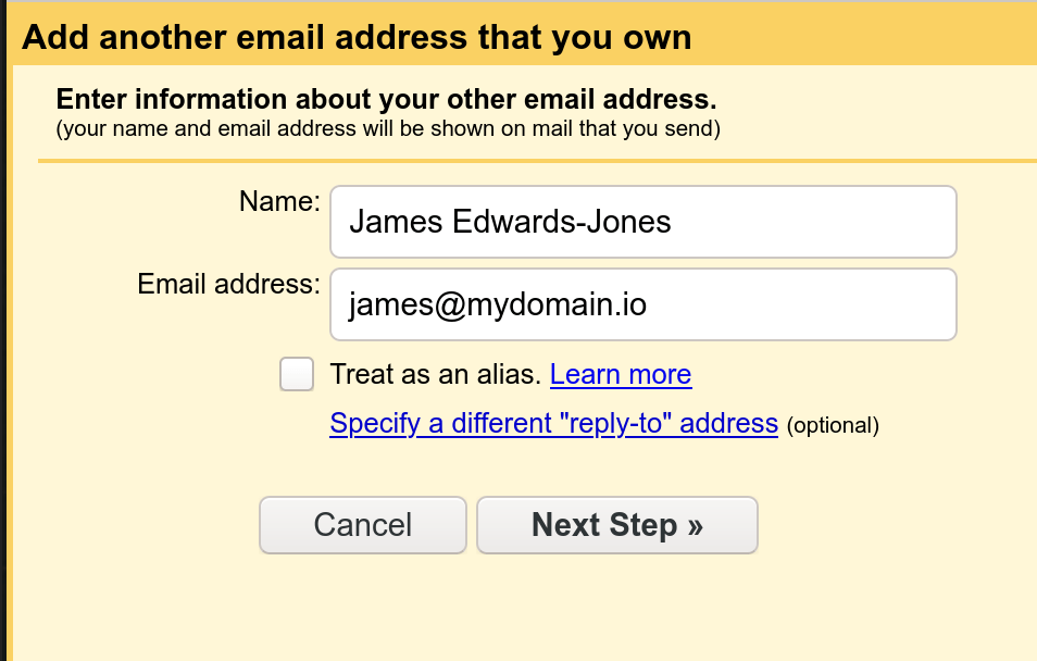Add a new email address from your Gmail account settings. Set your chosen name@domain.name as the email address, and untick ‘treat as an alias’.